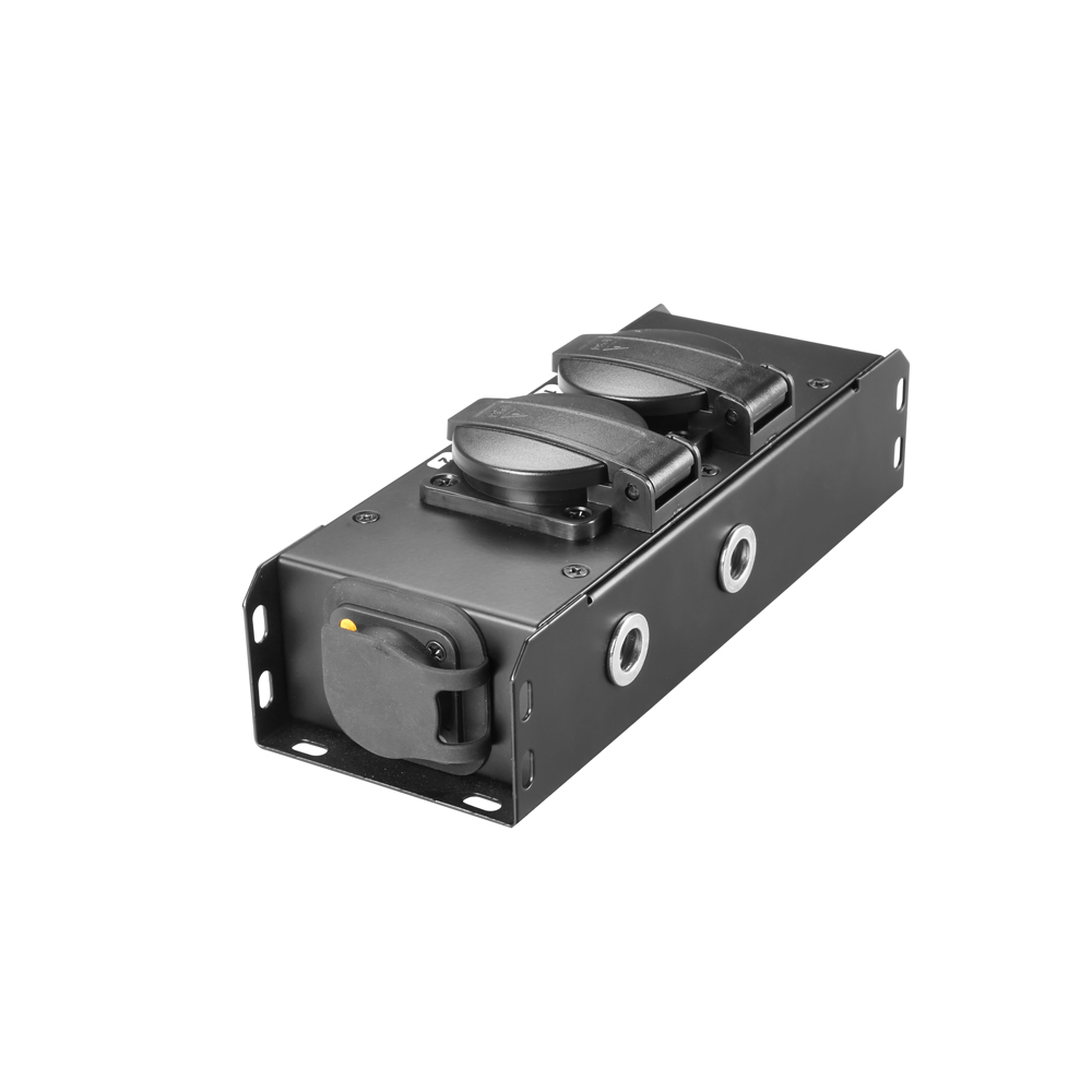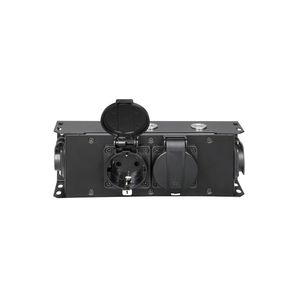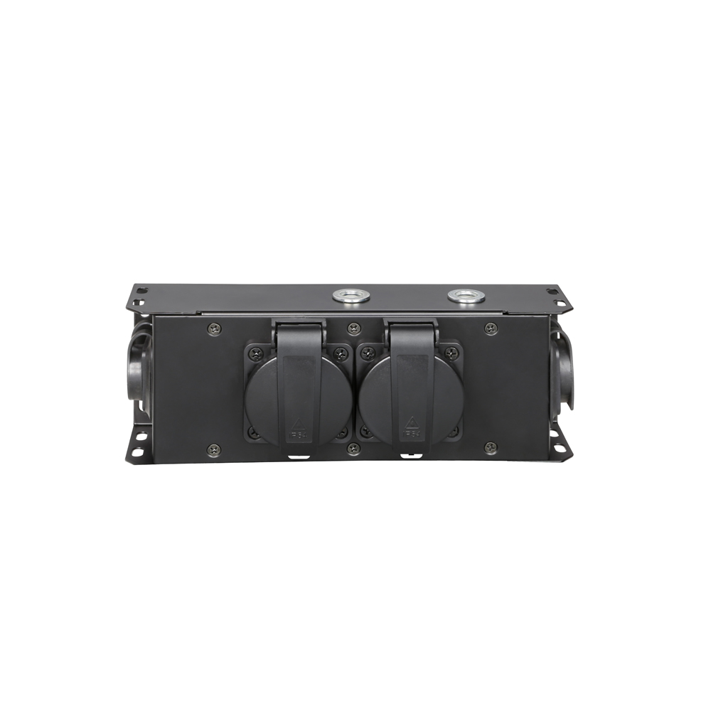 La ciabatta PROPORT 2T è ideale per la distribuzione ordinata e mirata della corrente elettrica su palcoscenici, traverse e rig. Il robusto alloggiamento in metallo presenta 2 prese Schuko dotate di coperchio incernierato, ingresso e uscita di colore nero/giallo per il passaggio e la distribuzione dell’elettricità e due inserti filettati M10 per il montaggio a sospensione e fisso.