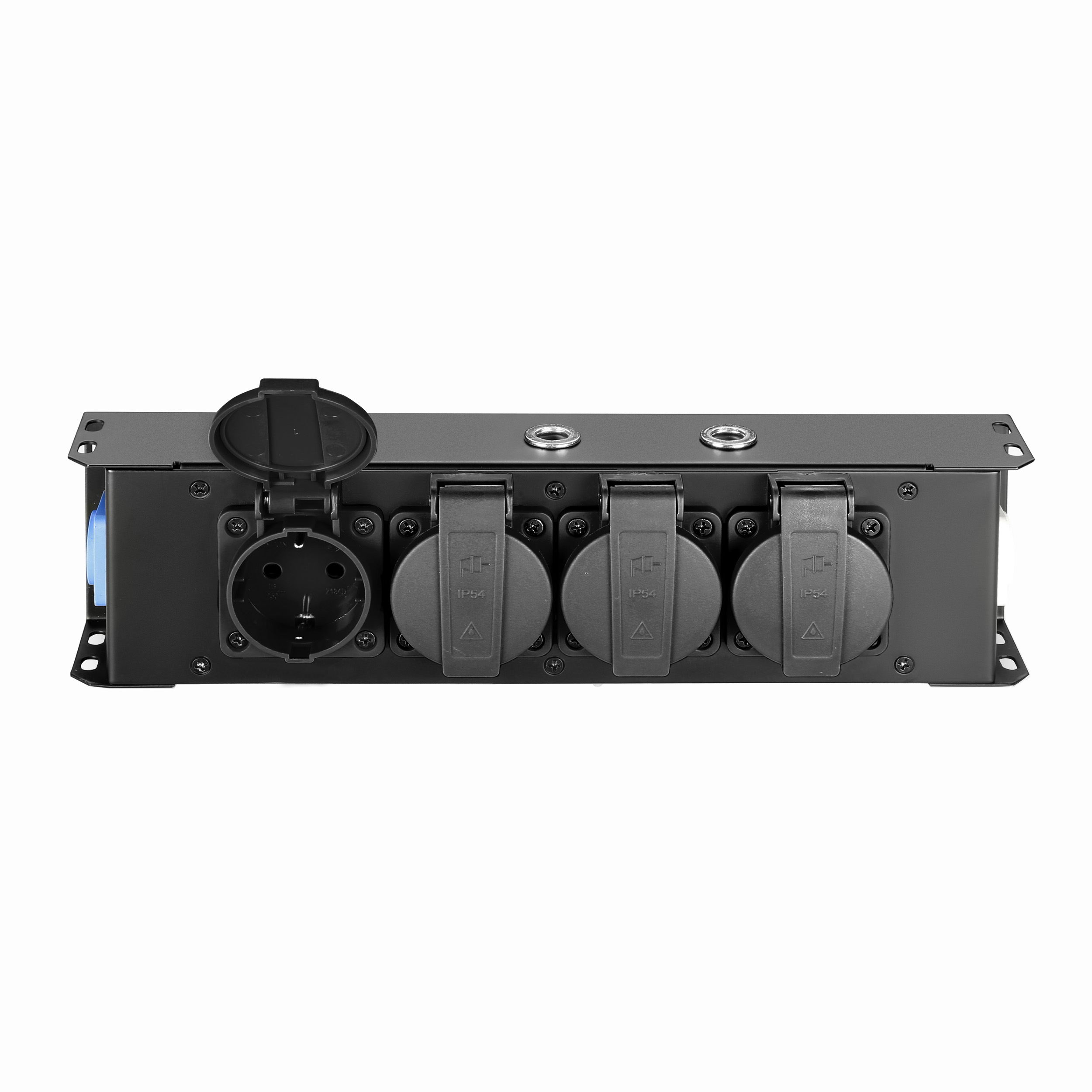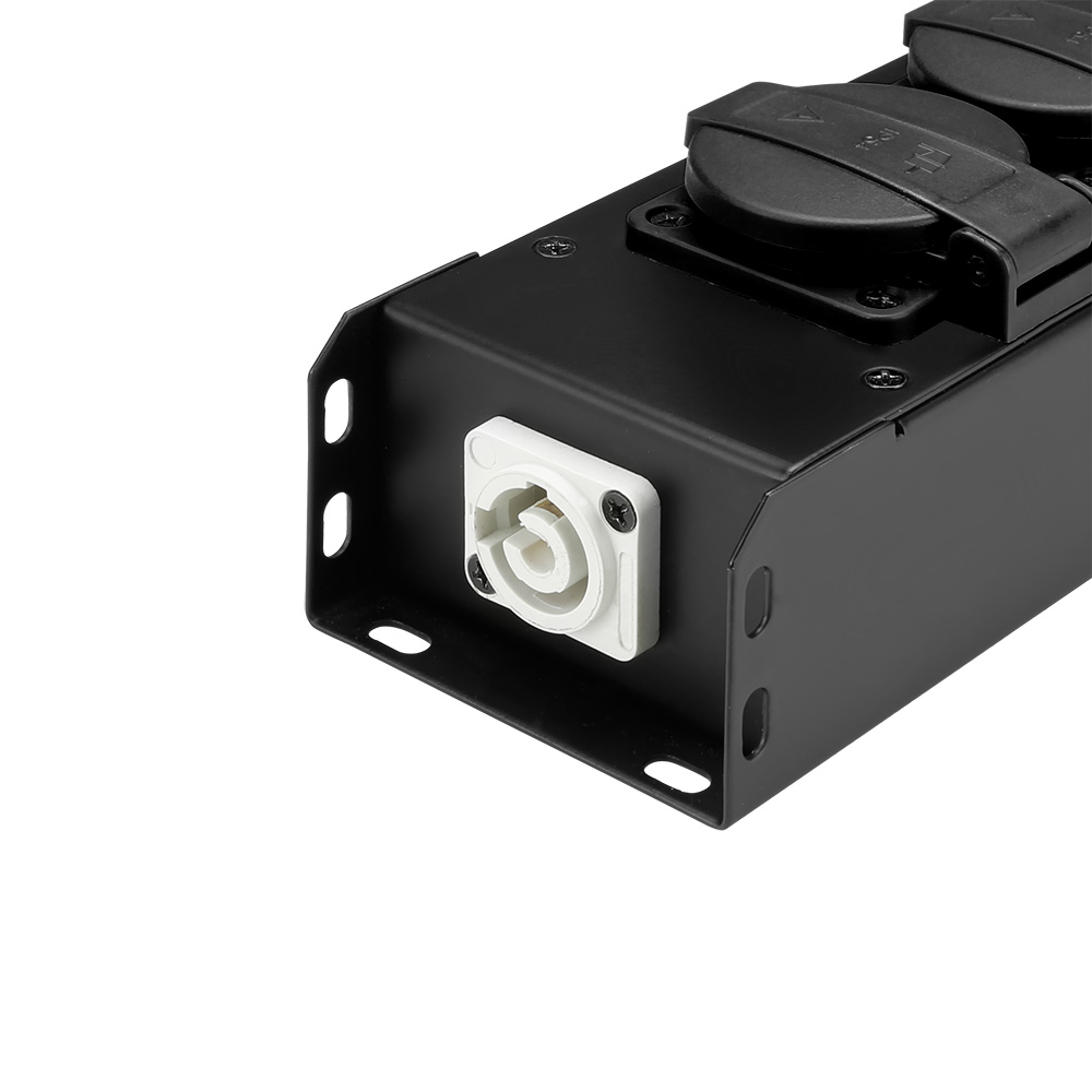 La ciabatta PROPORT 4 è ideale per la distribuzione della corrente elettrica in modo ordinato e mirato su palcoscenici, traverse e rig. Il robusto alloggiamento in metallo ha 4 prese IP54 con contatto di protezione dotate di coperchio, una presa Power Twist I/O azzurra e una bianca per l'ingresso e l'uscita della corrente e due raccordi filettati M10 per il montaggio a sospensione e fisso.