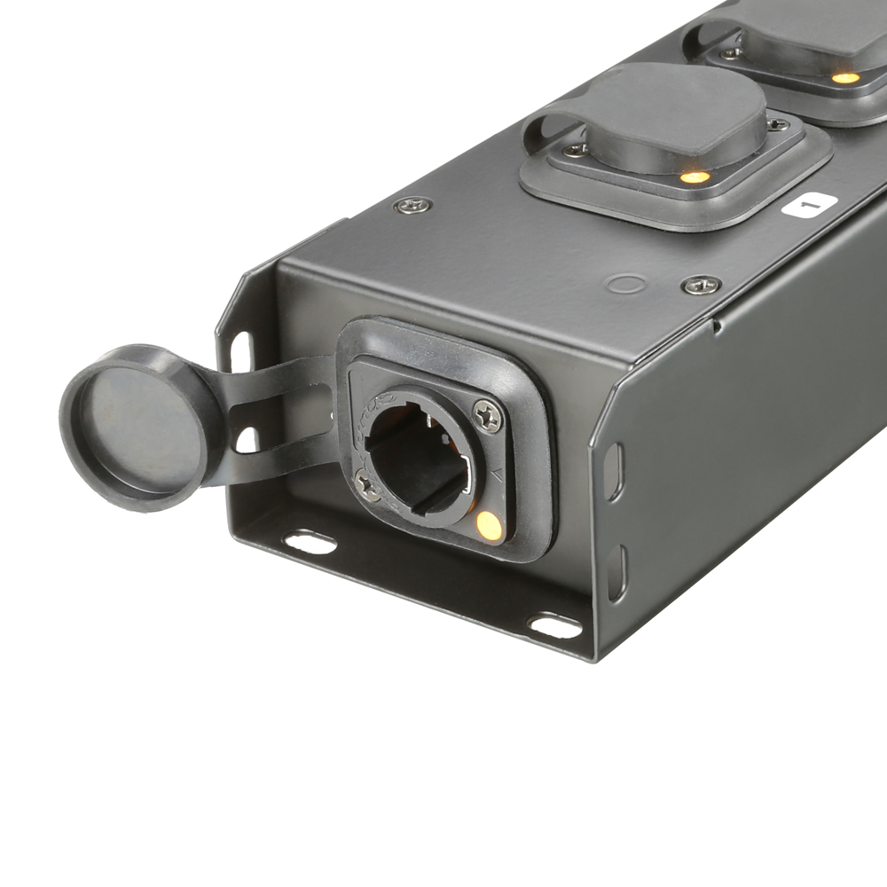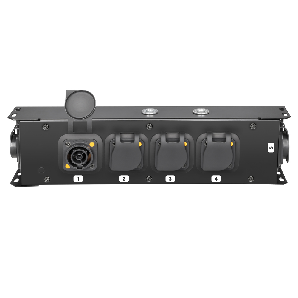 La ciabatta PROPORT 4TT è ideale per la distribuzione ordinata e mirata della corrente elettrica su palcoscenici, traverse e rig. Il robusto alloggiamento in metallo dispone di una presa d’ingresso Power Twist TR1 per l’alimentazione elettrica e di 5 prese di uscita Power Twist TR1, 2 delle quali sul lato superiore del distributore. Due raccordi filettati M10 per il montaggio a sospensione e fisso.